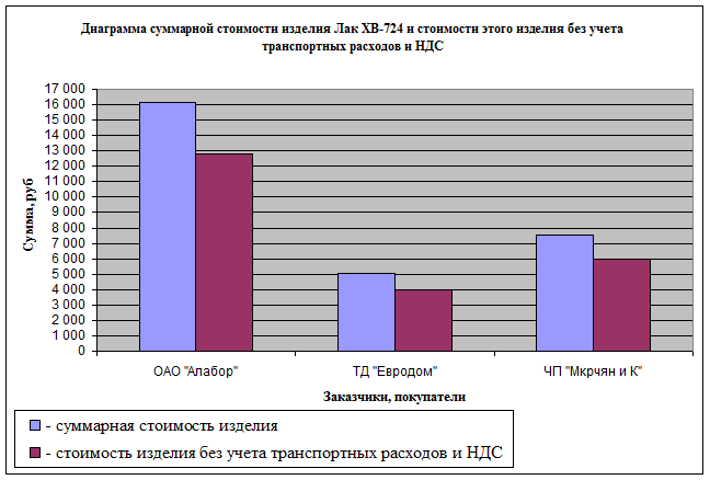 3. Построить столбиковую диаграмму суммарной стоимости одного вида изделия (любого) и стоимости этого изделия без учета транспортных расходов и НДС.