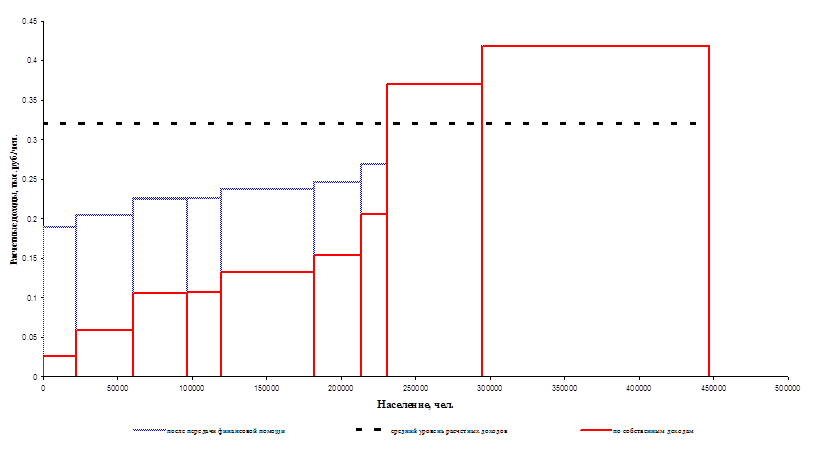 В приложении 2 приводятся графические иллюстрации степени горизонтального выравнивания, при различных способах обеспечения вертикальной сбалансированности. На приведенных графиках средний уровень расчетных доходов местных бюджетов в расчете на одного жителя совпадает со среднедушевым уровнем расходных потребностей местных бюджетов. При этом в случае закрепления единых нормативов отчислений от налогов отдельные местные бюджеты оказываются более несбалансированны, чем при передаче денежного трансферта.