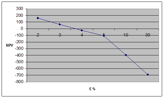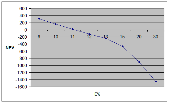при Е=10 %, NPV = +159,88 у.е. при Е=20%, NPV = - 904,53 у.е.