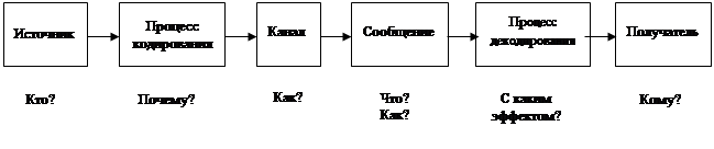 1). Отправитель — лицо, генерирующее идеи или собирающее информацию и передающее ее. 2). Сообщение — собственно информация, закодированная с помощью символов. 3). Канал — средство передачи информации. 4). Получатель — лицо, которому предназначена информация и которое интерпретирует ее.