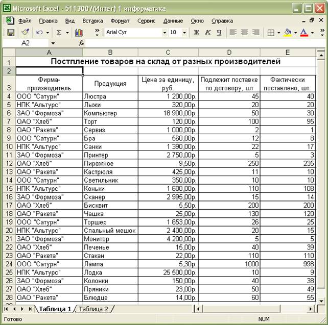 Имеется таблица 1 данных о поступлении на склад продукции от различных фирм-производителей.