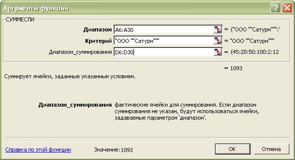 Для вычисления суммарного количества по 4 столбцу для фирмы Сатурн воспользуемся функцией СУММЕСЛИ.
