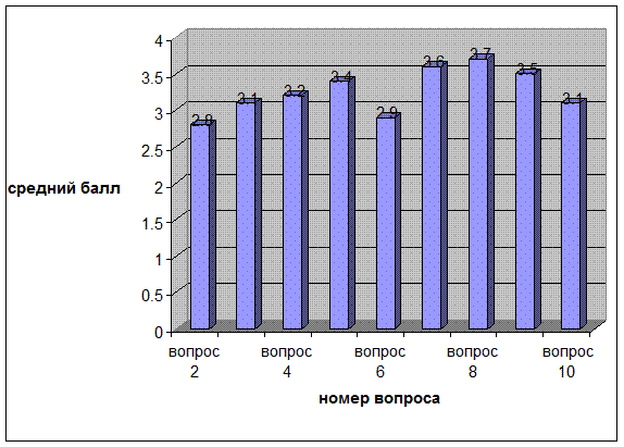 Как видно из рисунка, наибольший средний балл среди опрошенных получил вопрос № 8, а наименьший - вопрос № 2.