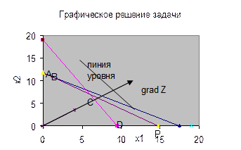 Вектор, компоненты которого являются коэффициентами целевой функции при переменных х1 и х2, называют вектором – градиентом целевой функции и обозначают grad Z.