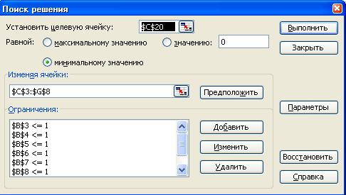 7. В окне Поиск решения нажать на кнопку выполнить. Через непродолжительное время появится диалоговое окно Результаты поиска решения и исходная таблица с заполненными ячейками С3:G8 для значений и ячейка C20 с минимальным значением целевой функции ( рис. 2.4)