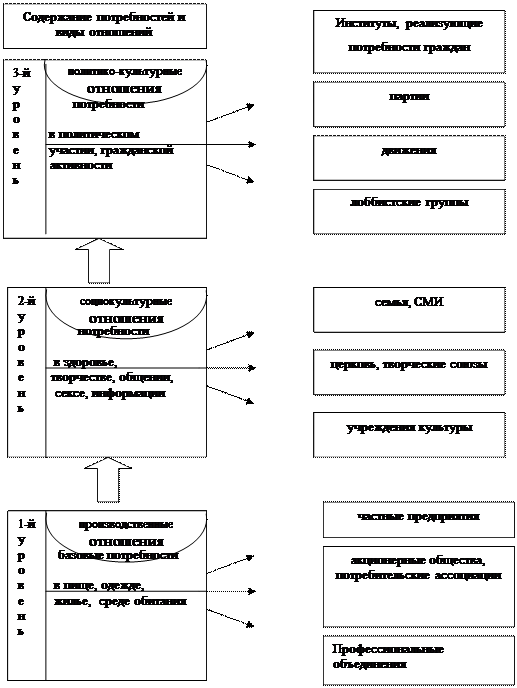 Базовые (первичные, витальные) потребности в пище, одежде, жилье и т.д., обеспечивающие жизнедеятельность индивидов, удовлетворяются благодаря производственным отношениям, составляющим первый уровень межличностных взаимосвязей. Эти потребности реализуются через такие общественные институты, как профессиональные, потребительские и иные объединения и ассоциации.