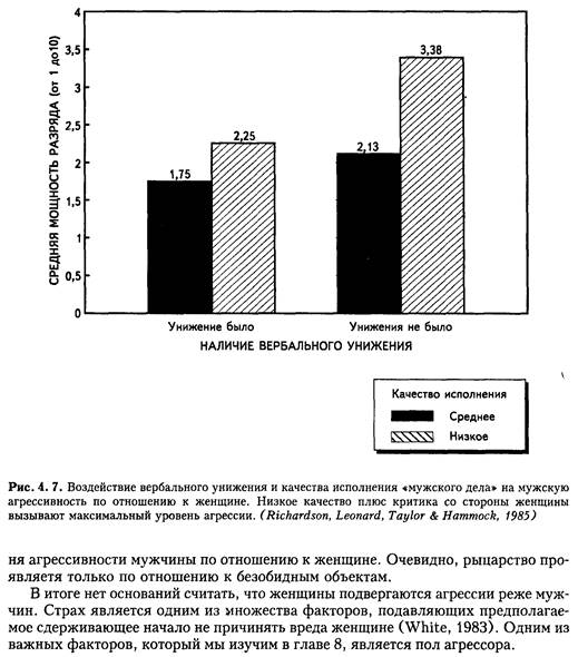 Эти результаты, как и данные других исследований (Rule & Leger, 1976), показывают, что сигналы о боля и эмпатия, возникающая в результате их появления, иногда могут быть эффективным средством для снижения уровня открытой агрессии. Жертвы, плачущие от боли, умоляющие о пощаде или посылающие сигналы о своем страдании другим способом, зачастую добиваются прекращений агрессивных действий по отношению к себе. Но, по всей видимости, этот метод оправдывает себя только в тех случаях, когда агрессоры до этого не подвергались сильному раздражению. Если же агрессоры перед этим подвергались сильным провокациям, попытки уменьшить агрессию посредством прямой обратной связи со стороны жертвы могут сыграть противоположную роль и только усилить интенсивность действий, которые собирались предотвратить.