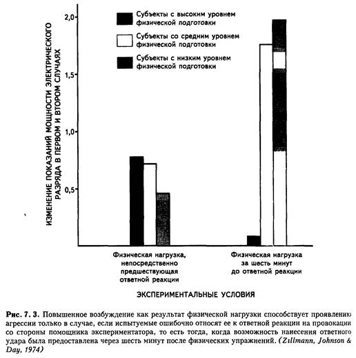 Другие исследования, однако, наводят на мысль о том, что у этой методики есть существенные недостатки. В частности, оказывается, что при наличии высокого уровня возбуждения рассматриваемый нами способ когнитивного вмешательства оказывается неэффективным. Более того, это верно даже для тех случаев, когда высокий уровень возбуждения не является результатом предварительной провокации. Данный факт полностью подтвердился во время исследования, о котором сообщает Зильманн (Zillmann, 1979). Процедура этого эксперимента состояла в следующем. Испытуемых разбили не две группы: попавших в первую заставляли энергично выполнять физические упражнения — крутить педали велотренажера; оказавшиеся во второй не были вовлечены в подобного рода деятельность. Выполнение физических упражнений обусловило высокий уровень возбуждения испытуемых из первой группы, в то время как уровень возбуждения испытуемых из второй группы оставался низким. Затем испытуемые подвергались сильным провокациям со стороны грубого экспериментатора, который отпускал язвительные замечания в их адрес. Далее, в соответствии с условиями эксперимента, испытуемым должна была быть предоставлена возможность отомстить обидчику (способом, аналогичным описанному ранее, — оценить его деятельность в качестве помощника экспериментатора), но незадолго до этого момента некоторые из испытуемых получили информацию, оправдывающую его поведение, подобную той, что описывалась нами выше: им сказали, что экспериментатор сильно расстроен и именно этим объясняется его некорректное поведение. Другие испытуемые такой информации не получали. Результаты показали, что эта информация в значительной степени способствовала снижению уровня ответной агрессии среди лиц, не занимавшихся на велотренажере и с низким уровнем возбуждения. Напротив, информация, объяснявшая причину поведения, не оказала подобного влияния на лиц с высоким уровнем возбуждения.