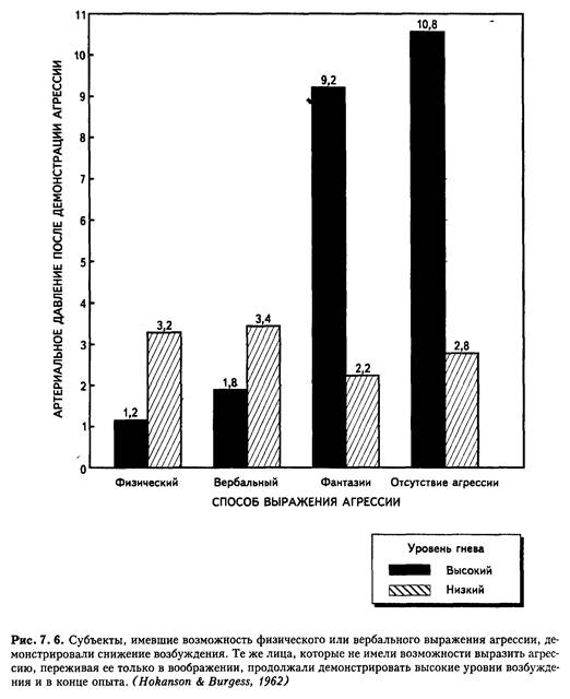 Например, в эксперименте, поставленном Зильманном и Кантором (Zillmann & Cantor, 1976), студенты-выпускники участвовали в опыте, якобы устанавливающем влияние зрительных раздражителей на физиологические реакции. В соответствии с поставленной целью на протяжении всего эксперимента у испытуемых несколько раз измерялись частота пульса, артериальное давление и температура тела. Каждый участник опыта имел дело с двумя различными экспериментаторами. Как водится, один из них был вежлив и любезен, второй, напротив, вел себя грубо и вызывающе, обвиняя испытуемых в том, что они отказываются сотрудничать, и отзываясь о вежливом экспериментаторе в весьма оскорбительной манере. На первых двух этапах опыта вежливый экспериментатор давал рациональное