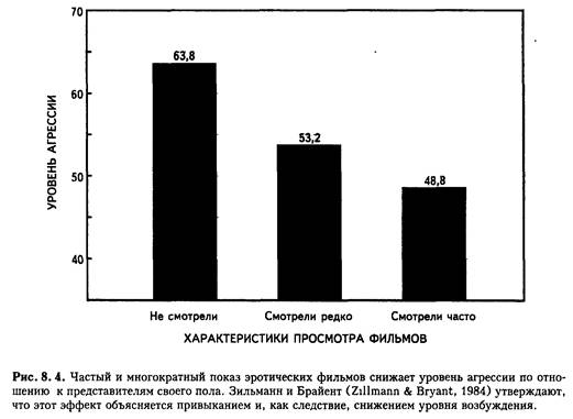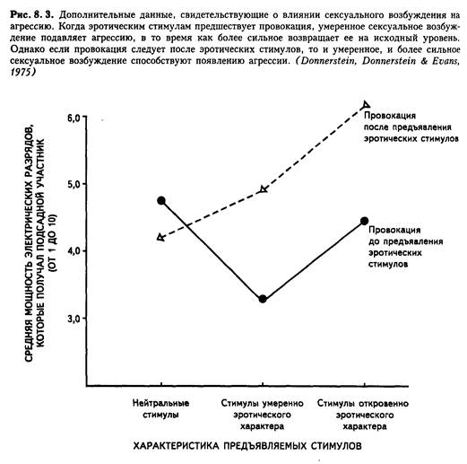 сочетаются с реакциями отвращения и омерзения. Более того, демонстрация сильно возбуждающих сексуальных материалов в условиях, когда индивиды не в состоянии разрядить такое возбуждение, может сама по себе привести к фрустрации. Таким образом, уже первые исследования по проблеме возможного влияния сексуальных стимулов на уровень агрессии дают возможность сделать следующее теоретическое заключение: умеренный уровень сексуального возбуждения действительно способствует снижению уровня агрессии, как и предполагает гипотеза несовместимых реакций. Однако высокие уровни возбуждения, вызванные более откровенным материалом, могут вызвать отрицательные реакции и сильное возбуждение, которое не уменьшает агрессию.