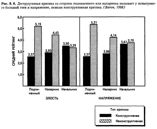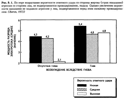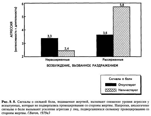Для того чтобы проверить гипотезу, согласно которой сильно раздраженные индивиды на сигналы о боли будут отвечать усилением агрессии, а нераздраженные — ослаблением, в нескольких экспериментах (Baron, 1974b, 1979a) помощник экспериментатора получал задание разозлить или проигнорировать испытуемых на первой стадии эксперимента, то есть до того, как им представилась бы возможность отомстить ему. В состояние сильного гнева испытуемых приводили грубые замечания по поводу выполнения ими заданий и негативные оценки их работы.