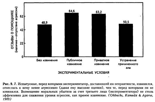 Результаты показали, что извинения действительно играют весьма существенную роль в подавлении ответной агрессии. Испытуемые, перед которыми помощник извинился, дали ему более высокую оценку, сообщив о том, что чувствуют себя лучше, и демонстрировали более низкие уровни агрессии, чем те, перед кем он не извинился. Более того, простое «возмещение ущерба» — путем приватного извинения или признания экспериментатором ошибок, совершенных его помощником, — оказалось менее эффективным для снижения уровня агрессии, чем публичное извинение (см. рис. 9. 7).