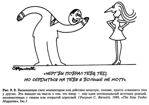 Многим из нас приходилось сталкиваться со следующей ситуацией. Нас раздражает или выводит из себя какой-то человек, затем совершенно неожиданно он делает или говорит что-то, что нас смешит. Когда это происходит, наше раздражение, по крайней мере частично, исчезает (см. рис. 9. 9). Такие случаи наводят на мысль о том, что юмор и вызываемый им смех могут быть еще одной реакцией, несовместимой с открытой агрессией.