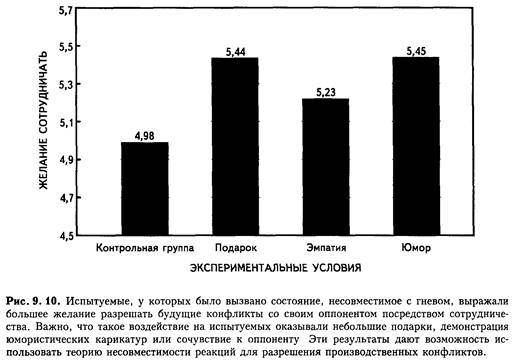 В первом из поставленных экспериментов (Baron, 1984) испытуемые, мужчины и женщины, изображали руководителей большой организации, которые обсуждали две проблемы, постоянно стоящие на повестке дня в их воображаемой компании: следует ли переместить ее на крайний юг США и следует ли вкладывать огромные средства в производство нового продукта? Одним из участников обсуждения был помощник экспериментатора, выражавший несогласие с любой точкой зрения, излагаемой испытуемыми. Однако способ выражения несогласия, к которому он прибегал, постоянно менялся. В одном случае он выражал несогласие спокойным, уверенным тоном (например, «Я понимаю вас, но согласиться все же не могу»). В другом случае он выражал свое несогласие в брюзгливо-высокомерной манере (например, «Боже мой, что за чушь вы несете?»). Следующий этап эксперимента начинался после окончания обсуждения «двух проблем». На этот раз экспериментатор на несколько минут покидал комнату, якобы для того чтобы взять необходимые формы. Все это время его помощник либо сидел спокойно, либо действовал в соответствии с одной из трех моделей поведения, предназначением которой являлась генерация у испытуемых положительных эмоций, несовместимых с гневом. Он либо предлагал им конфеты, заявляя, что еще не «пришел в себя» после важных экзаменов; либо просил их оказать ему помощь в выборе самой смешной карикатуры для очередного эксперимента.