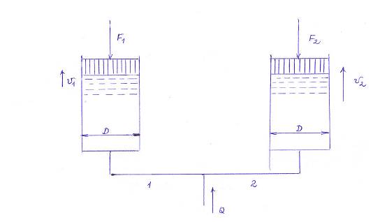 Перемещение поршней гидроцилиндров с диаметром D = 25 см. осуществляется подачей рабочей жидкости (n = 1,5 см2 / с, g = 14 000 Н/м3) по трубам 1 и 2 одинаковой эквивалентной длины l = 20 м и диаметром d = 5 см. Определить силу F2, при которой скорость перемещения второго поршня была бы в два раза больше скорости первого поршня. Расход в магистрали Q первый поршень нагружен силой F1.