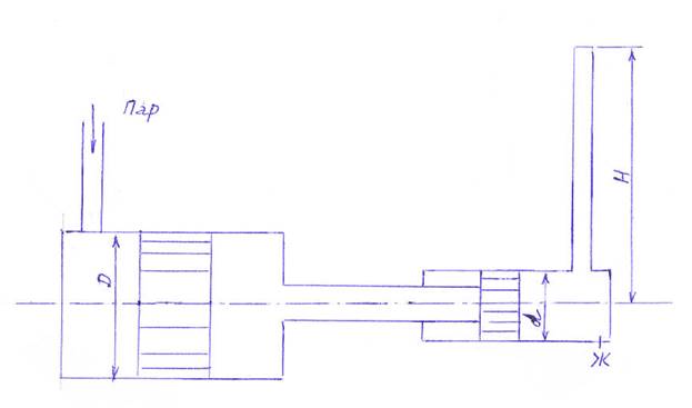 Паровой прямодействующий насос подает жидкость Ж на высоту Н. Каково рабочее давление пара, если диаметр парового цилиндра D, а насосного цилиндра d ? Потерями на трение пренебречь.