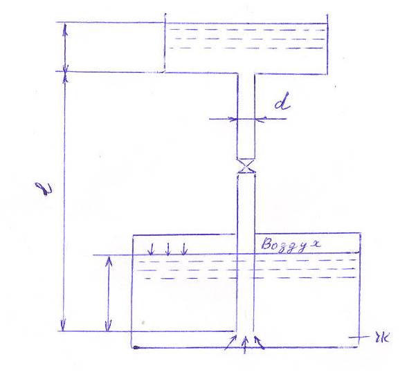 Жидкость Ж подается в открытый верхний бак по вертикальной трубе длиной l и диаметром d за счет давления воздуха в нижнем замкнутом резервуаре. Определить давление р воздуха, при котором расход будет равен Q. Принять коэффициент сопротивления: вентиля zв = 8,0; входа в трубу zвн = 0,5; выхода в бак zвых = 1,0. Эквивалентная шероховатость стенок трубы Rэ = 0,2 мм.