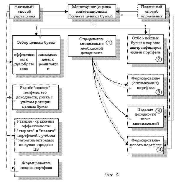 Менеджер, занимающийся активным управлением, должен суметь отследить и приобрести наиболее эффективные ценные бумаги и максимально быстро избавиться от низкодоходных активов. При этом важно не допустить снижение стоимости портфеля и потерю им инвестиционных свойств, а следовательно, необходимо сопоставлять стоимость, доходность, риск и иные инвестиционные характеристики «нового» портфеля (т. е. учитывать вновь приобретенные ценные бумаги и продаваемые низкодоходные) с аналогичными характеристиками имеющегося «старого» портфеля. Этот метод требует значительных финансовых затрат, так как он связан с информационной, аналитической экспертной и торговой активностью на рынке ценных бумаг, при которой необходимо использовать широкую базу экспертных оценок и проводить самостоятельный анализ, осуществлять прогнозы состояния рынка ценных бумаг и экономики в целом.