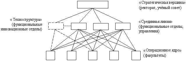 Собственно говоря, как следует из анализа Г. Минцберга, такой путь реформирования управления проходят все организации, в том числе и высшие учебные заведения, чтобы успешно работать в среде рыночной экономики. Рассмотренная выше модель (см. рис. 1) трансформируется в модель, представленную на рис. 2.