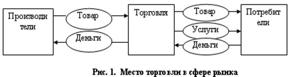 Разделение актов обмена товаров на два, разделенные во временив и пространстве, объективно потребовало посредников между товаропроизводителями, обменивающимися созданными для продажи товарами. Торговля становится таким посредником, представляя собой особый вид товарно-денежного обмена Д - Т - Д', обслуживая все экономические связи рыночного хозяйства, кругооборот экономических ресурсов и денег (рис.1).