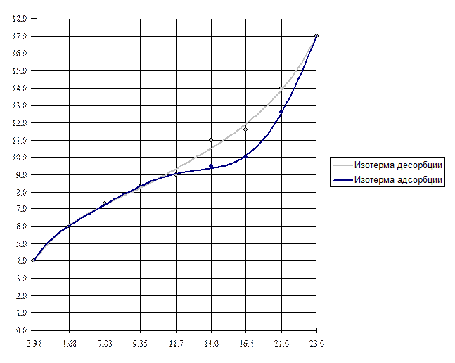 2. При построении графиков, оказалось, что изотерма адсорбции – нижняя кривая, изотерма десорбции – верхняя кривая не совпадают, что свидетельствует о наличии явления, называемого гистерезисом.
