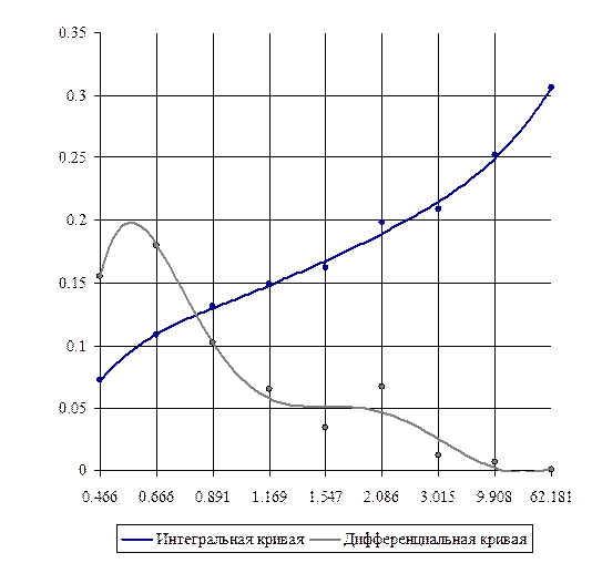 Рис. 3. Интегральная и дифференциальная кривые распределения пор по радиусам.