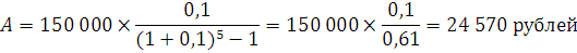 Задача 5. Рассчитать размер ежегодных отчислений в банк под 10 % годовых, для того чтобы в течение 5 лет накопить 150 000 рублей.