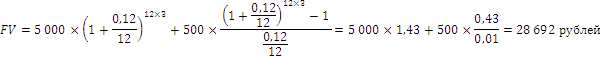 Задача 9. В начале года на банковский счет была помещена сумма в 5 000 рублей, затем в течение 3 лет в конце каждого месяца на счет помещались одинаковые взносы в размере 500 рублей. Банк размещает вклады под 12 % годовых. Какая сумма накопится в конце срока?