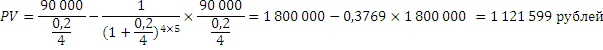 Задача 10. Предполагается, что инвестиционный проект будет приносить его владельцу постоянный доход в размере 90 000 рублей в конце каждого квартала. Какова текущая стоимость будущих доходов, предполагаемых получить в течение 5 лет, если годовая ставка дисконтирования 20 %?