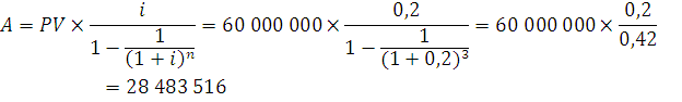 60 000 000 : 3 года = 20 000 000 рублей под 20 % годовых