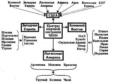 В процессе непрерывного перемещения трудовых ресурсов сформировался мировой рынок рабочей силы. Принято различать четыре его основных центра: Ближний Восток, США, Западную Европу и Латышскую Америку (см. схему).
