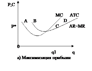 Но для совершенно конкурентного предприятия Р = AR = MR, и, следовательно, условие первого порядка может быть представлено и как равенство предельных затрат цене: MC(q*) = P. Таким образом, фирма максимизирует прибыли или минимизирует убытки, когда ее производство соответствует точке, в которой предельные издержки равны предельному доходу (и цене продукции).