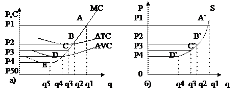 Кривая предложения совершенно конкурентного предприятия представлена на рис.3б. Здесь точки А' , В' , С' , D' соответствуют точкам А, В, С, D кривой MC на рис. 3а. Множество таких точек формирует участок кривой предложения, лежащий выше точки D', соответствующей минимуму AVC на рис. 3a. Таким образом, кривая предложения совершенно конкурентного предприятия в краткосрочном периоде представляет собой возрастающую ветвь кривой предельных затрат, которая лежит выше минимума средних переменных затрат. При более низком, чем minAVC, уровне рыночной цены кривая предложения совпадает с осью цен (участок OP4 на рис. 3б). Если функции средних переменных и предельных затрат известны, определить функцию предложения совершенно конкурентного предприятия можно так:
