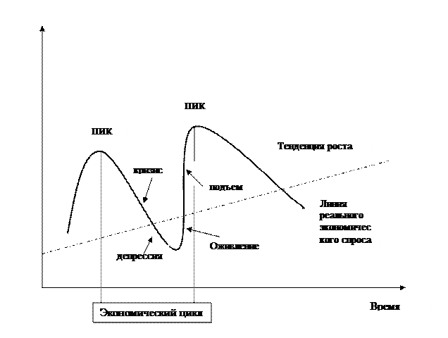 Таким образом, цикличность как форма движения рыночной экономики имеет своим эпицентром кризис, в котором, обнаруживаются и предел, и импульс роста экономики. Вызывая массовый моральный износ основного капитала, кризис расчищает путь для массовых инвестиций, причем на новом техническом уровне. Следовательно, моральный износ техники и динамика научно-технического прогресса превращает обновление основного капитала в синхронное в масштабах всей экономики. А изменчивость конъюнктуры придаёт массовому обновлению основного капитала дополнительную неравномерность. Отсюда непрерывные колебания деловой активности, чередование преимущественно экстенсивного (фаза подъема) и преимущественно интенсивного (после кризиса) типов экономического роста. А реальный циклический процесс предстает сложным явлением, обусловленным оборотом основного капитала, научно-техническим прогрессом, динамикой конъюнктуры. [2, c. 286-288]