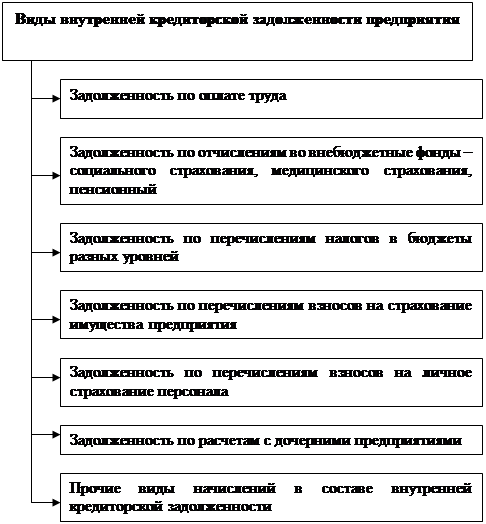 Внутренняя кредиторская задолженность одна из форм краткосрочной кредиторской задолженности предприятия, представленная переходящей задолженностью по заработной плате, отчисления в бюджет и внебюджетные фонды, отчисления на страхование и т.п. Начисление по этим платежам производится предприятием ежедневно (по мере осуществления текущих хозяйственных операций), а погашение этих обязательств в определенные (установленные) сроки и в диапазоне до одного месяца. Они являются для предприятия бесплатным источником пользования заемных средств.