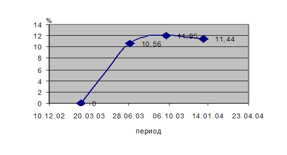 Если проанализировать какую часть составляют больше внеоборотные активы или оборотные активы, то можно заметить, что в на 1.03.03 вообще нет внеоборотных активов и далее доля оборотных активов выше, чем внеоборотных.