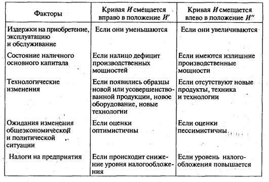 На графике рис. 2 показано смещение кривой спроса на инвестиции (И) либо вправо (И'), либо влево (И") как проявление влияния «неценовых» факторов на инвестиционный климат (табл. 1).[3]