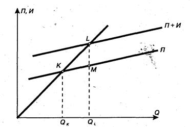 Линия потребления (П) указывает на равновесный объем ЧВП (QК), когда расходы ограничиваются рамками потребления. Одна ко, учитывая тот факт, что часть расходов была отложена в форме сбережений, надо полагать, что на предложенные сбережения предъявят спрос инвесторы, которые, получив финансовые ресурсы, используют их для приобретения инвестиционных товаров, т.е. осуществят инвестиции (И) в реальный сектор экономики. Следовательно совокупные расходы будут уже состоять из потребления и инвестиций (П+ И).
