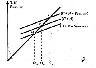 Пусть QК характеризует равновесный уровень ЧВП при отсутствии внешней торговли. Этот равновесный уровень определяется, как нам известно, пересечением биссектрисы и линии (П + И) в точке К. Теперь допустим, что наша страна имеет положительное сальдо внешнеторговой деятельности. В таком случае график совокупных расходов для открытой экономики принимает вид: (П + И+ Sэкс.-имп.)- Увеличение совокупных расходов на положительное сальдо вызывает увеличение внутреннего ЧВП до объема QL, а точка L характеризует равновесный объем производства и экспорта продукции.