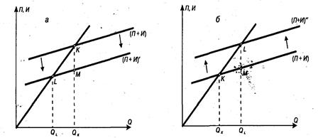 На рис. 10, б представлен инфляционный разрыв, который возникает в результате превышения совокупных расходов над уровнем ЧВП при полной занятости. Данное количественное превышение расходов над объемом производства находит свое графическое выражение в смещении линии (П + И) в положение (П + И)" как проявлении избыточного спроса. Предприниматели при полной занятости и задействованных ресурсах не в состоянии расширить реальный объем производства до значения QL. Наступившая инфляция спроса обусловливает лишь рост национального объема ЧВП до величины QL. Поэтому точка L будет характеризовать новое состояние равновесия, но с учетом инфляционной составляющей в ЧВП, соответствующее объему QL. Чтобы были обеспечены безынфляционный ЧВП и экономическое равновесие при полной занятости, требуется сокращение расходов, а на рис. 10, б— возвращение линии (П + И)" в прежнее состояние (П+ И), при котором равновесие устанавливается в точке К при объеме реального ЧВП, равном QК. Здесь также налицо мультипликационный эффект, но он находит свое выражение в росте не реального, а номинального ЧВП.