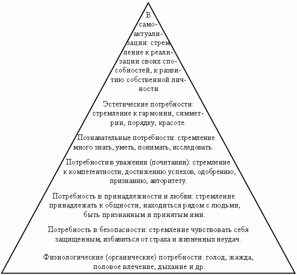 Согласно Маслоу, человеческие потребности располагаются в виде иерархии. Иными словами, появлению одной потребности обычно предшествует удовлетворение другой, более насущной. Человек — это животное, постоянно испытывающее те или иные желания. Маслоу определяет пять наборов целей, которые он именует базовыми потребностями. К ним он относит: физиологические нужды, потребность в безопасности, потребность в любви, потребность в удовлетворении чувства собственного достоинства и, наконец, потребность в самоактуализации. Иерархическая природа этих потребностей или целей означает, что доминантная цель монополизирует сознание и определенным образом стимулирует и организует различные способности организма, потребные для ее достижения. Менее насущные потребности минимизируются, или даже забываются, или отрицаются. Основанием этой иерархии Маслоу считает физиологические потребности и, прежде всего, потребность в пище.
