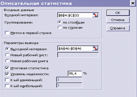 Для проведения автоматизированного статистического анализа совокупности выборочные данные представлены в формате электронных таблиц процессора Excel в диапазоне ячеек B4:C35. Выборочные данные приведены в табл. 1.