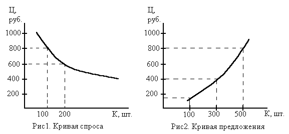Установим с помощью совершенно условного примера зависимость величины спроса (С) от цены реализации (Ц) и построим кривую спроса: по цене 800 руб. за штуку покупатели находят всего 100 единиц товара, а снижение цены до 600 руб. повышает спрос до 200 единиц (рис.1). Но кто же удовлетворяет спрос? Производитель (продавец). Поэтому анализ рынка невозможен без построения кривой предложения, показывающей, сколько товара и по каким ценам может быть предложено производителем. Так, по цене 100 руб. за штуку производитель предлагает 100 единиц товара, по цене 400 руб. — 300 единиц по цене 800 руб. — уже 500 единиц (рис.2). Высокая цена побуждает производителя к наращиванию выпуска продукции.