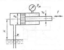 Определить величину и направление силы F, приложенной к штоку поршня для удержания его на месте. Справа от поршня находится воздух, слева от поршня и в резервуаре, куда опущен открытый конец трубы – масло трансформаторное. Показание пружинного манометра – 80000 Па (абс). Дано: Н=8м, D= 120, d=60 мм.