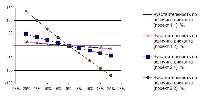 Когда сравнивается несколько альтернативных проектов, проект с более крутыми кривыми чувствительности считается более рискованным, поскольку сравнительно небольшая ошибка в оценке переменой, дает большую ошибку в прогнозируемой NPV проекта. Таким образом, анализ чувствительности может помочь проникнуть в суть рисковости проекта.