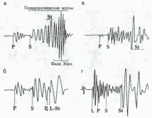 а - при невозможности идентификации волн, вступающих после первого периода S волны; б - при допущении распространения волн Лэмба в столбе скважинной жидкости; в - в открытой скважине; г - в обсаженной скважине при условии частичного цементирования/