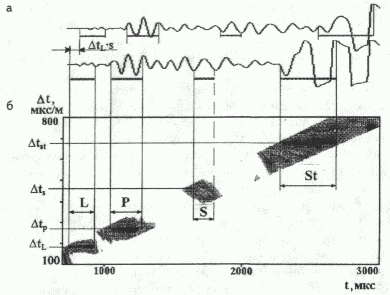 РИС. 2. ОПРЕДЕЛЕНИЕ ЗНАЧЕНИЙ ИНТЕРВАЛЬНЫХ ВРЕМЕН (DT) И ВРЕМЕННЫХ ИНТЕРВАЛОВ СУЩЕСТВОВАНИЯ ВОЛН ЛЭМБА, ПРОДОЛЬНОЙ, ПОПЕРЕЧНОЙ, СТОУНЛИ; ИДЕНТИФИКАЦИЯ ТИПОВ ВОЛН, ЗАРЕГИСТРИРОВАННЫХ В ОБСАЖЕННОЙ СКВАЖИНЕ: