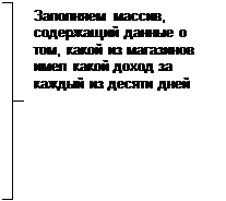 Где M[3][10] – массив, содержащий данные о том, какой доход каждый из магазинов получил в каждый из десяти дней, Dm[3] – массив, содержащий данные о том, какой максимальный общий доход получил каждый из магазинов за десять дней, Df – наибольший доход фирмы за день, d – день, в который фирма получила максимальный доход, Sd – суммарный доход фирмы за день, Mm[3][2] – массив, содержащий данные о том, какой максимальный доход за день получил каждый из магазинов и в какой день, Sr[10] – среднее значение дохода фирмы за каждый из десяти дней, i, j – временные переменные.