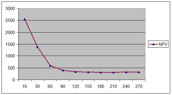 при Е=90 %, NPV =+397,6 у.е. при Е=240 %, NPV = +319,1 у.е.