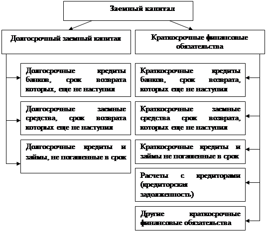 Заёмный капитал классифицируется по видам, срокам использования и другим признакам. Все формы заёмного капитала, используемого предприятием, представляют собой его финансовые обязательства, подлежащие погашению в предусмотренные сроки. Заёмный капитал – это кредиты банков и финансовых компаний, займы, кредиторская задолженность, лизинг, коммерческие бумаги и др., привлекаемые для финансирования развития предприятия на возвратной основе денежные средства и другое имущество.